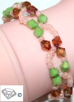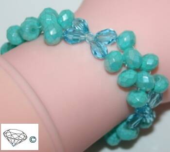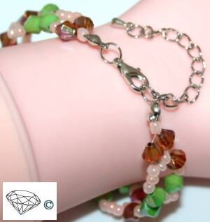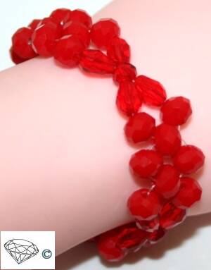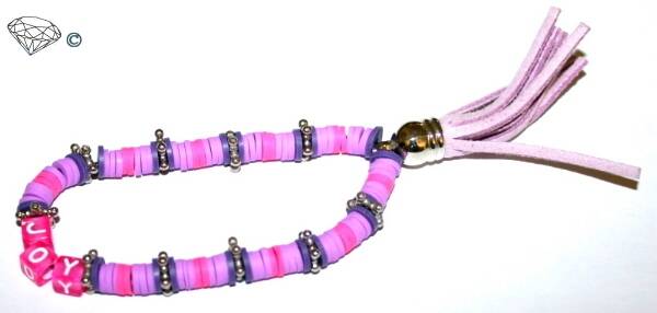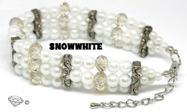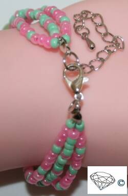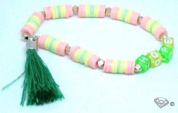 Armbanden geregen op elastiek zijn met een knoop en een druppeltje sieradenlijm vast gemaakt.